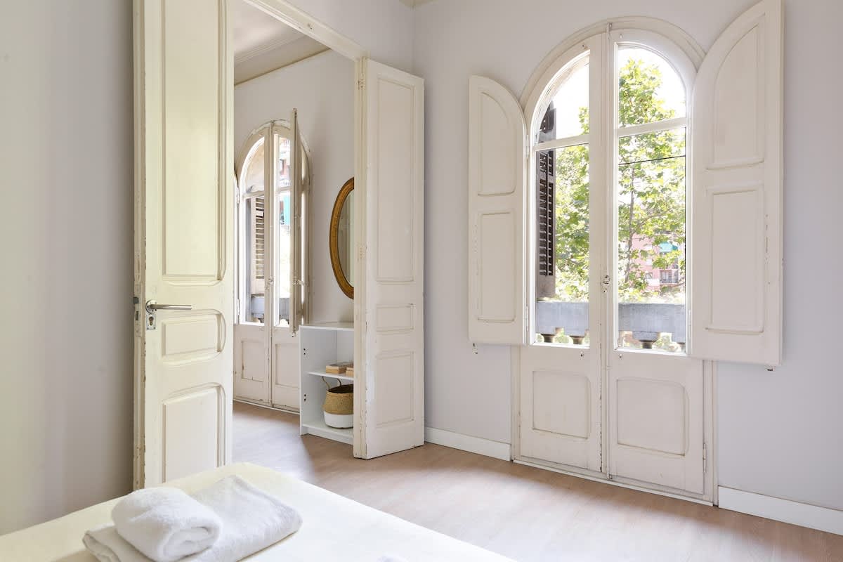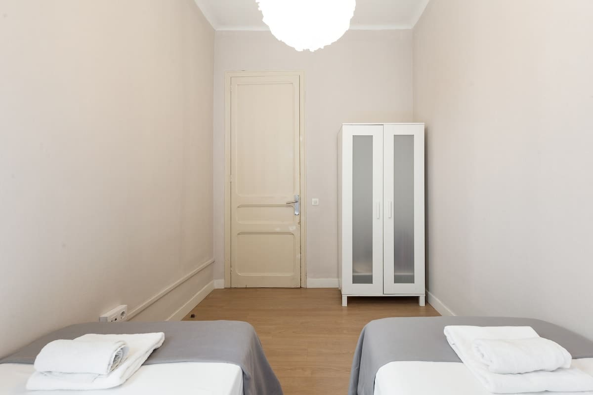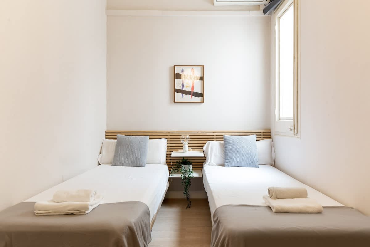 There are beds for all. The apartment is quite spacious - especially for Barcelona norms - and has about 100 mtrs. You will find 3 bedrooms and 2 bathrooms. The dining/living is located on the back side of the building. Bedrooms in the middle and front of the apartment.