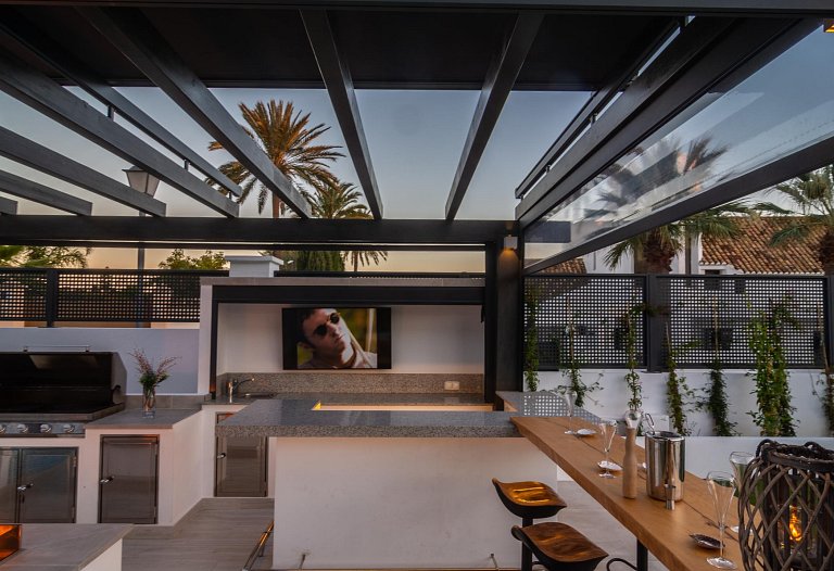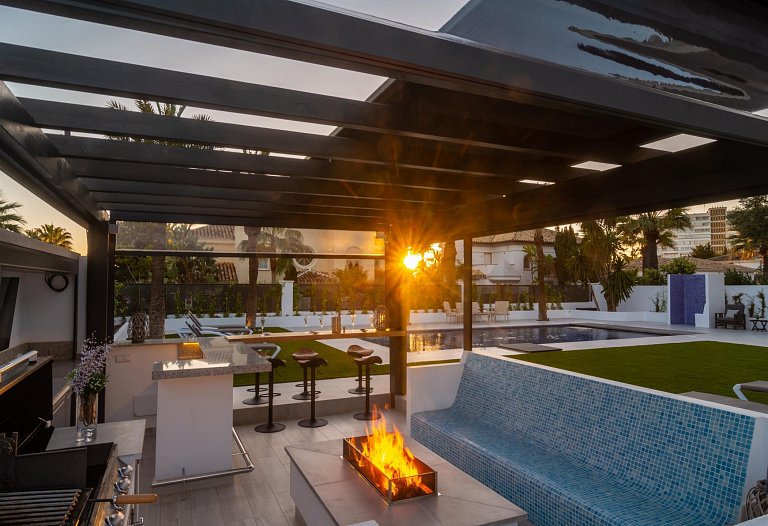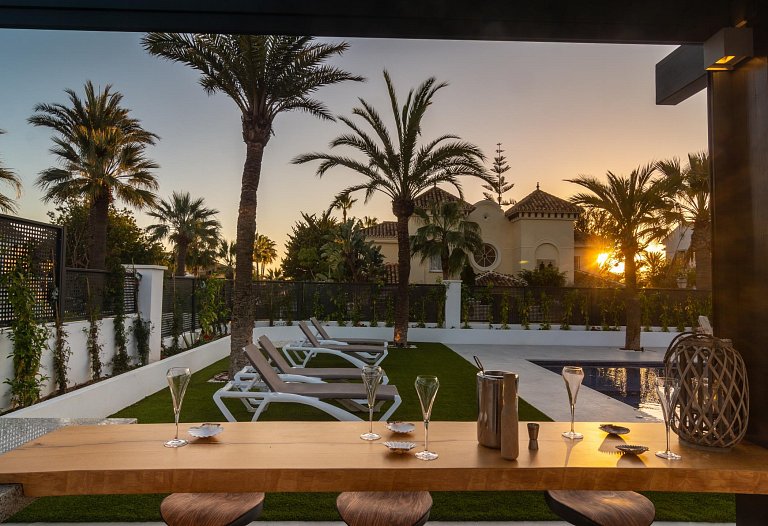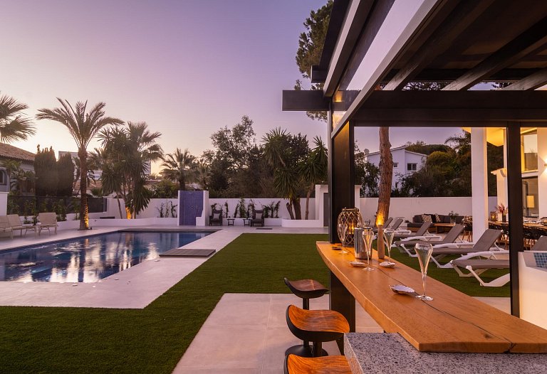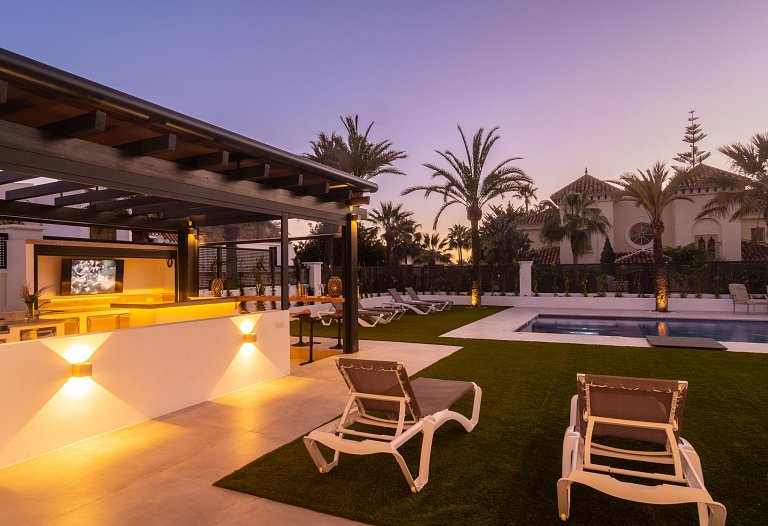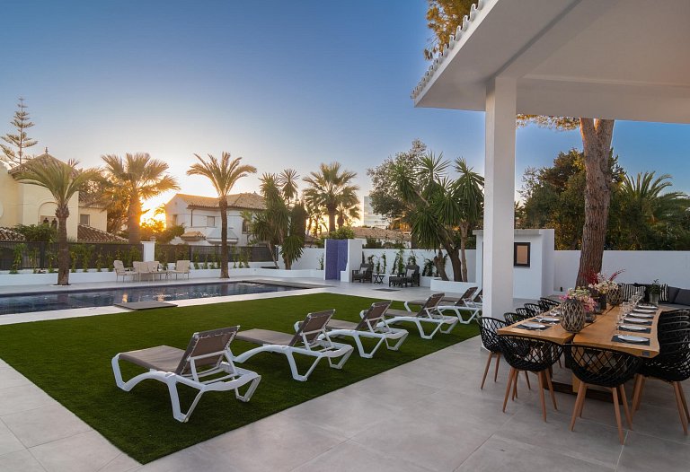 El supermercado más cercano, Carrefour, está a solo 700 metros (10 minutos a pie) de la villa. En la misma zona tienes una muy buena panadería alemana y varios restaurantes como el italiano, Da Fabio o Veranda Verde dentro del Royal Tennis Club.El centro comercial más grande y centro comercial en la Costa del Sol, La Canada, con más de 150 tiendas, está a solo 8 km (8 minutos en coche). Aquí se puede encontrar una gran variedad de productos, desde ropa hasta alimentos o materiales de construcción, incluyendo el hipermercado Al Campo, cine y centro de bolos. También hay otros supermercados locales en la zona (a solo 5 km), Carrefour, Mercadona, Lidl o OpenCor. Es importante que sepas que todas las tiendas están cerradas los domingos, excepto OpenCor (situado a 5 minutos en coche) que está abierto las 24 horas. El restaurante más cercano es South Beach, a solo 200 metros de la villa, justo en la playa. También puede disfrutar de la playa en el restaurante Los Flores o el club de playa Nosso, ambos situados a 200 metros de la villa. Aquí también se pueden alquilar tumbonas y pasar un día entero relajándose en la playa con buena comida y excelentes cócteles. Mozaic es otro buen restaurante abierto todo el día, para el desayuno, el almuerzo y la cena y se encuentra a solo 450 metros de la villa.