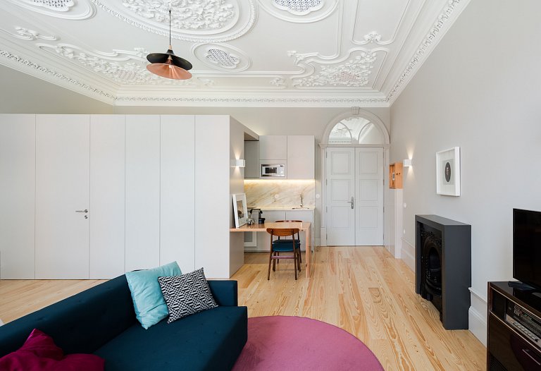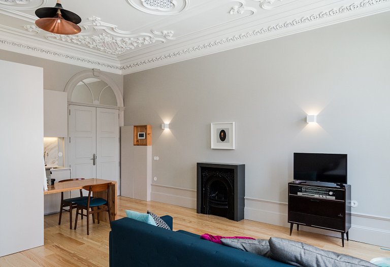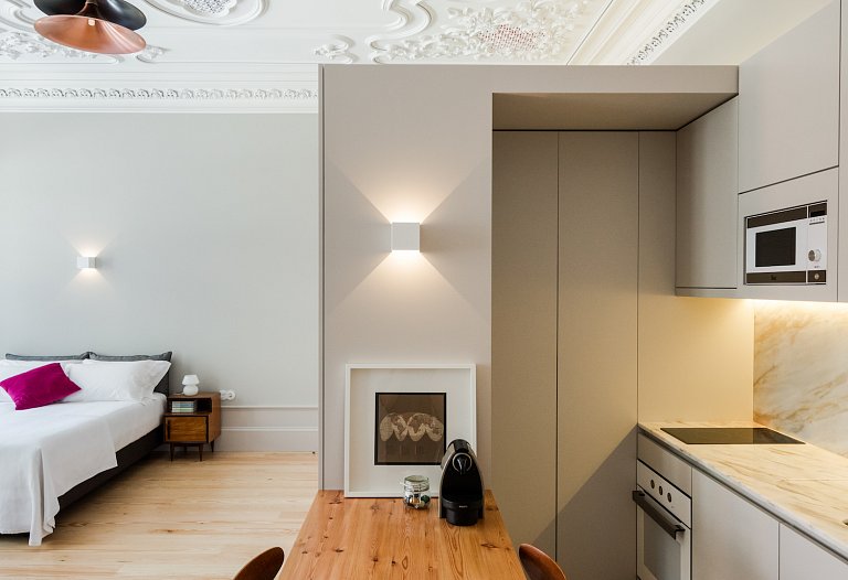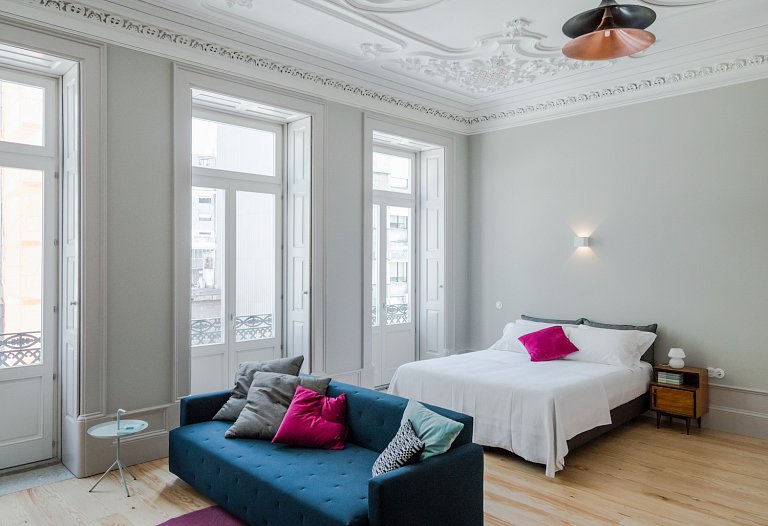 For a romantic stay in a XIX century atmosphere in a refined setting, you will appreciate the charm of this very picturesque studio, with capacity up to 4 people. The bed is equipped with brand new, comfortable and ecological bedding. The sleeping sofa has capacity for two more people. Sheets are provided and the studio will be ready for your arrival. You have the option of having 2 single beds or one double bed, you can chose your preferred option. The lovely place includes a furnished kitchenette area and a big bathroom. The atmosphere is friendly and welcoming, with wooden floor, XIX century traditional ceilings and Portuguese marble counters. This studio is ideal to recharge your batteries and enjoy the comfort and relaxation combined with the traditional heritage that Porto has to offer. Housekeeping (daily) Complimentary toiletries Hair dryer Television Electronic / magnetic keys Iron / ironing board (on request) Internet access – free Kitchenette Espresso machine Tea and Coffee