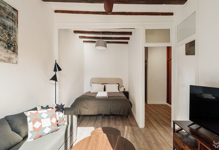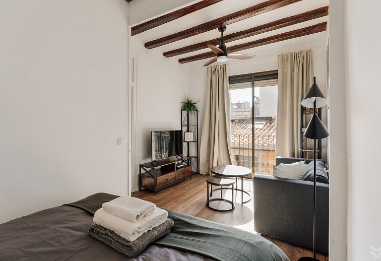 Bright and welcoming apartment with charming wooden beam ceilings and a cozy balcony, offering a pleasant stay for couples or solo travelers. The space combines a clean, modern design with warm details, creating a relaxed and inviting atmosphere.