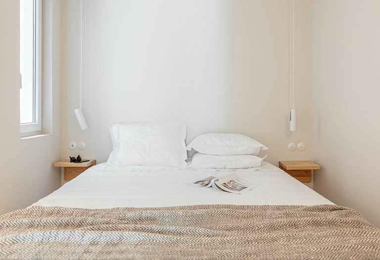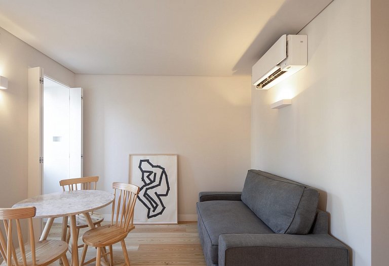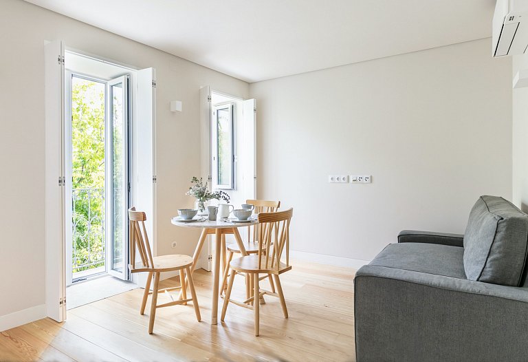 The apartment is located on the second floor without elevator and consists of a living room with a small balcony, kitchenette, bedroom and bathroom. It is fully equipped with everything guests need for a stay in Lisbon. Formidably decorated, it features traditional materials such as Portuguese “azulejo”, “lioz” stone and Riga wood that, together with the unmistakable light of Lisbon, will surely provide a unique experience for those who stay there.