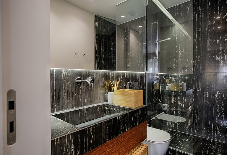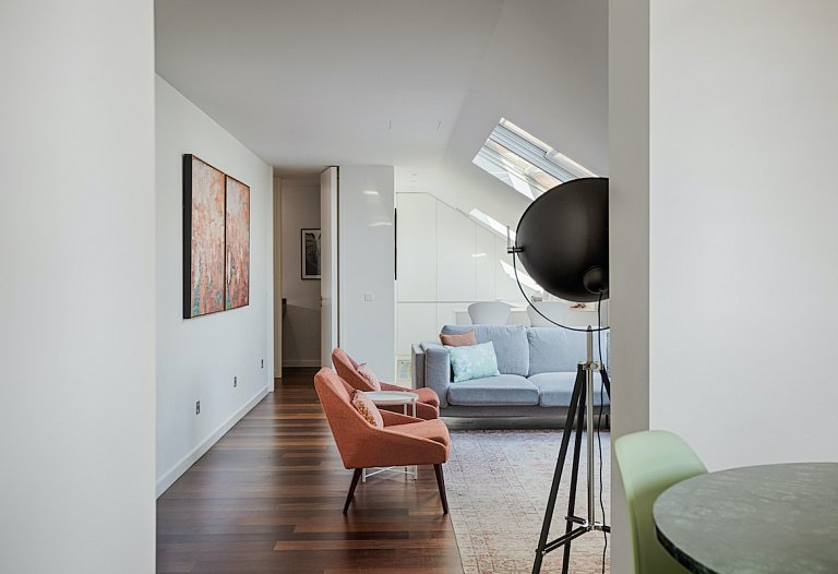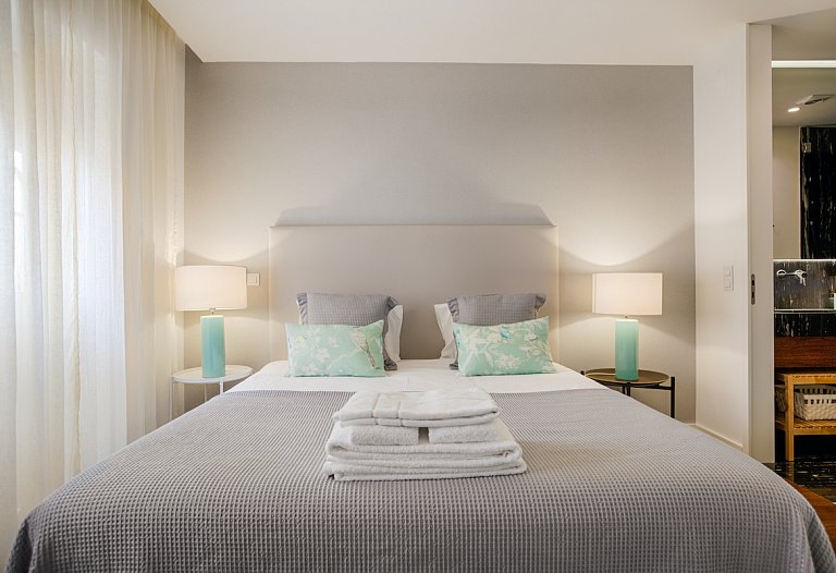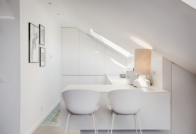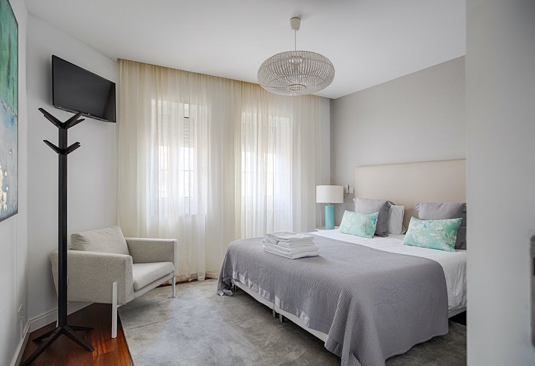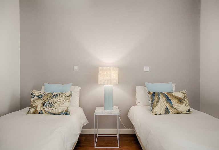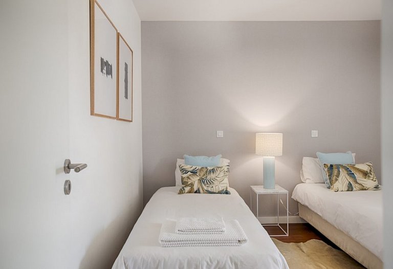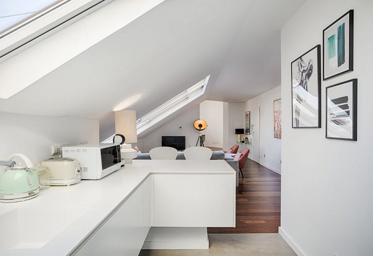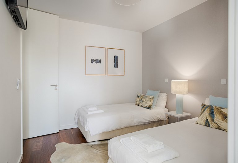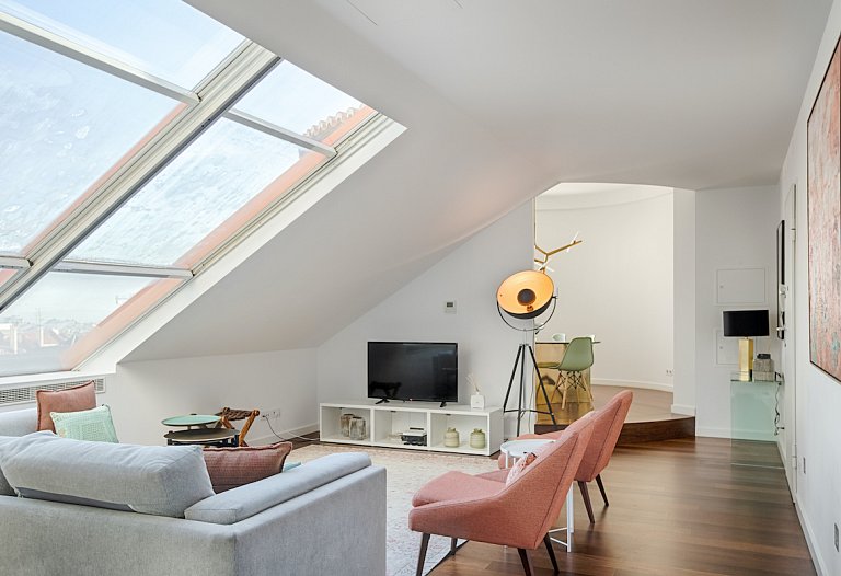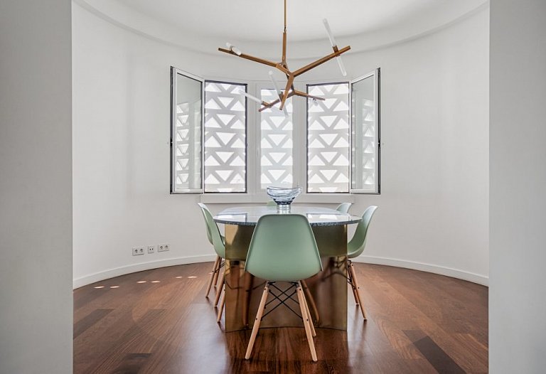 A stunning 2 bedroom apartment located on Avenida Fontes Pereira de Melo, one of the main central avenues in Lisbon. Penthouse apartment on the 7th floor, but with the convenience of an elevator. The location is superb, right between Saldanha and Marquês de Pombal, with El Corte Inglês, Parque Eduardo XII, or Campo Pequeno close by. Even if we are in one of the premium city center areas, the trendy Historical Center, Rossio, Alfama and Graça are just 2 km away. The metro stops right in front of the building (Picoas Station) and Chiado and Bairro Alto are just 4 stops away. The building has a clean well-lit lobby and an elevator to take you right to the door of the apartment. The apartment was recently renovated and designed to accommodate with comfort and character up to 4 people, providing AC and Wi-Fi, and many modern conveniences. As you enter the apartment, you’ll find a fresh and distinct architectural layout with a careful hand chosen design. A comfortable living room will welcome you at the end of a busy day. The kitchen is fully equipped with a Krups machine, oven, stove, microwave, dishes, silverware and other items should you decide to stay in for homemade meals (although many wonderful restaurants and cafes await you nearby). A skylight window brings in lots of light and a panoramic view of the city center. It’s modern, but also comfortable. The large round dining room is separate and offers privacy but is also adjacent to the living/sitting room. So, you can have two different environments while enjoying a drink or meals or relaxing with a book or to watch TV. The apartment has 2 bedrooms, each with a bathroom en suite. One bedroom has a large double (queen) bed and the other has two twin beds that can be put together. The Avenida Fontes Pereira Melo 25 is a historically significant building designed by the Portuguese architect Cassiano Branco. one of the main architects of the Modernist period in Portugal. Built before 1950, its unique “cone” tower has been keeping watch over the transformation and growth in Lisbon for decades. At the base of the building, you will find a handy new supermarket with its own bakery, that closes at 11pm — convenient for last minute needs. Avenida da Liberdade is less than a 10 minutes walk away with its many haute couture boutiques and some of the best restaurants in town. The apartment also has a parking place in the nearby Picoas Plaza parking building, a 2 minutes walk away.