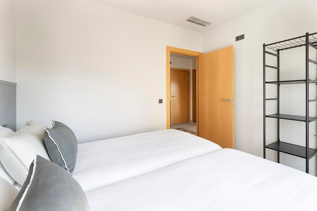 These apartments boast two bedrooms, catering perfectly to both couples and families. The master bedroom boasts a sumptuous double bed adorned with soft linens, promising a tranquil night's rest. Meanwhile, the second bedroom offers two comfortable single beds, ideal for children or additional guests. Both bedrooms are thoughtfully furnished, providing ample storage space for your belongings and ensuring a peaceful retreat at day's end.