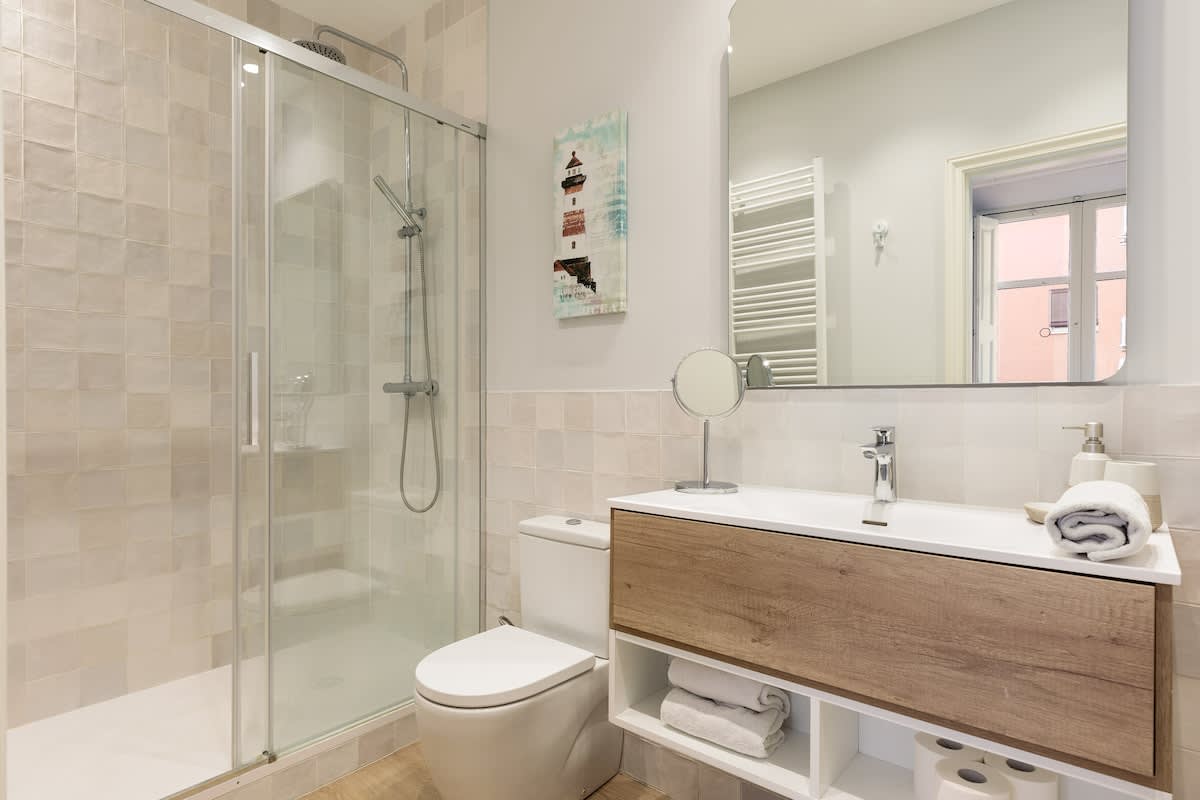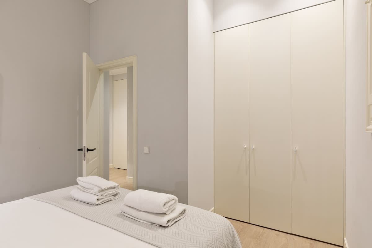 Discover spacious luxury and tasteful décor within our centrally located retreat. The apartment is bathed in natural light, courtesy of expansive French doors in the living room and master bedroom. It features two generously sized bedrooms: the master suite boasts a king-size bed (180cm), convertible into twin beds upon request, and an ensuite with a spacious walk-in shower. The second bedroom offers a queen-size bed (160cm), also adaptable to twin beds, and access to a large walk-in shower. The living room serves as a comfortable hub for relaxation and dining, with a convertible sofa bed to accommodate additional guests, and opens onto a quaint balcony, mirroring the master suite.