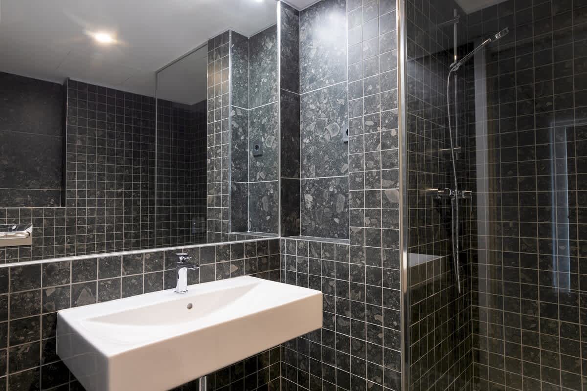 This apartment features two comfortable bedrooms, each with large windows that create a bright and serene ambiance. The bathroom is modern and elegant, equipped with high-quality amenities and a refreshing shower.