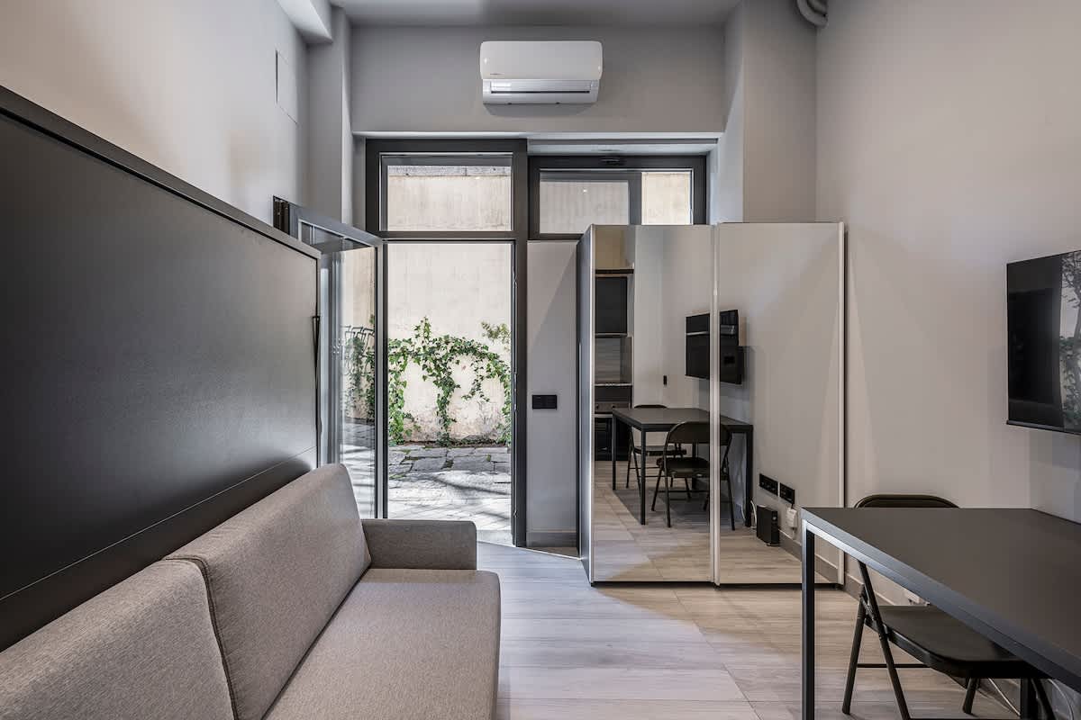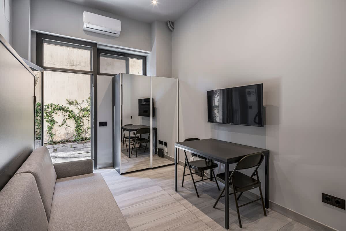 You'll find a compact yet fully-equipped kitchen featuring modern appliances such as an oven, washing machine, microwave, and fridge. The living area is tastefully furnished with a comfortable sofa bed, allowing for both relaxation and a good night's sleep. Adjacent to the seating area is a table with chairs, providing a cozy spot for meals, work, or leisure activities. During warmer days, you can rely on the air conditioning to keep the temperature pleasant and enjoyable.