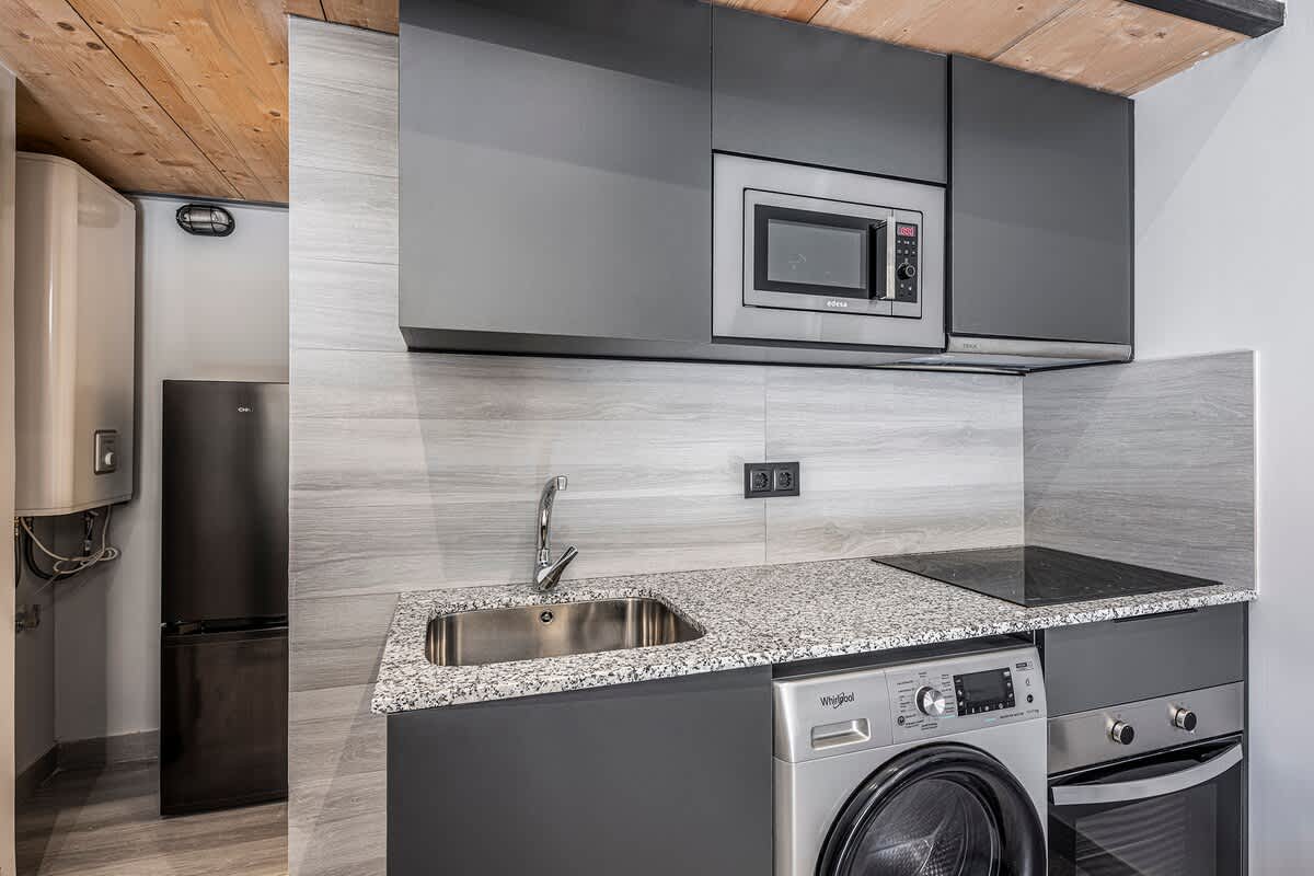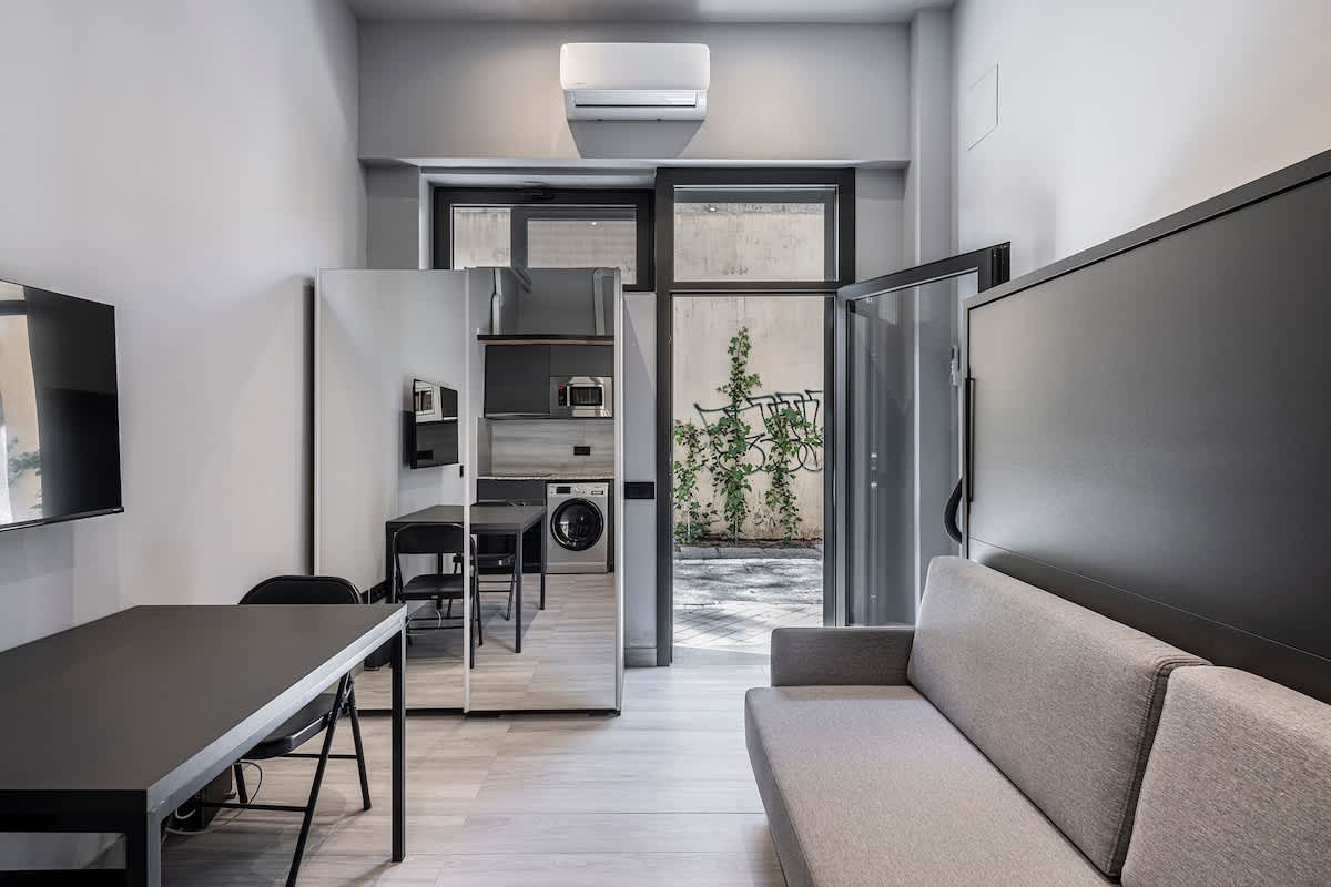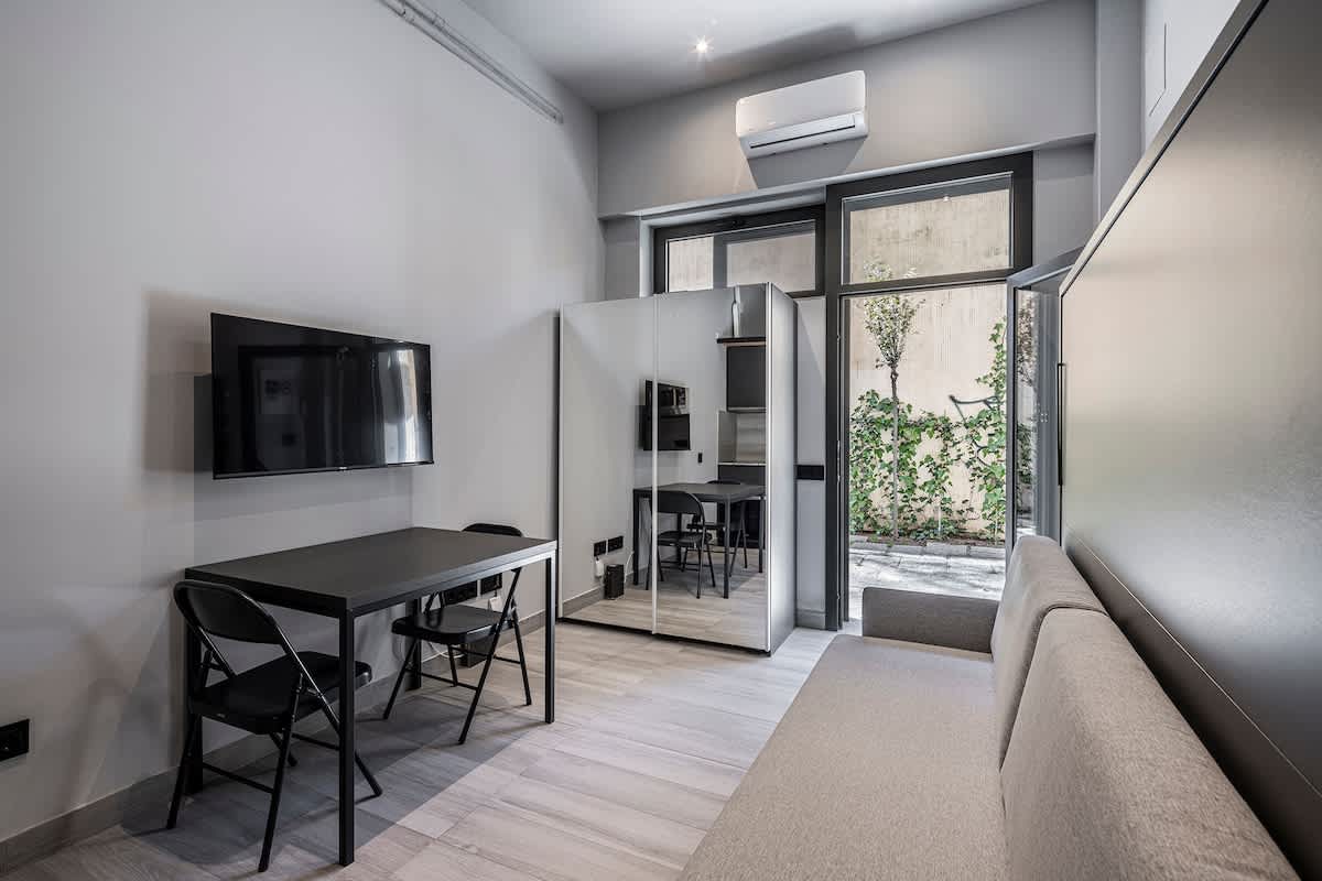 You'll find a compact yet fully-equipped kitchen featuring modern appliances such as an oven, washing machine, microwave, and fridge. The living area is tastefully furnished with a comfortable sofa bed, allowing for both relaxation and a good night's sleep. Adjacent to the seating area is a table with chairs, providing a cozy spot for meals, work, or leisure activities. During warmer days, you can rely on the air conditioning to keep the temperature pleasant and enjoyable.