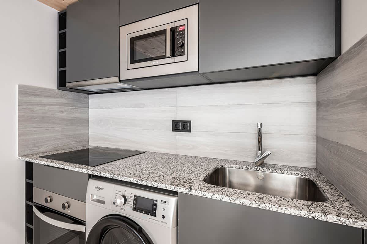 You'll find a compact yet fully-equipped kitchen featuring modern appliances such as an oven, washing machine, microwave, and fridge. The living area is tastefully furnished with a comfortable sofa bed, allowing for both relaxation and a good night's sleep. Adjacent to the seating area is a table with chairs, providing a cozy spot for meals, work, or leisure activities. During warmer days, you can rely on the air conditioning to keep the temperature pleasant and enjoyable.