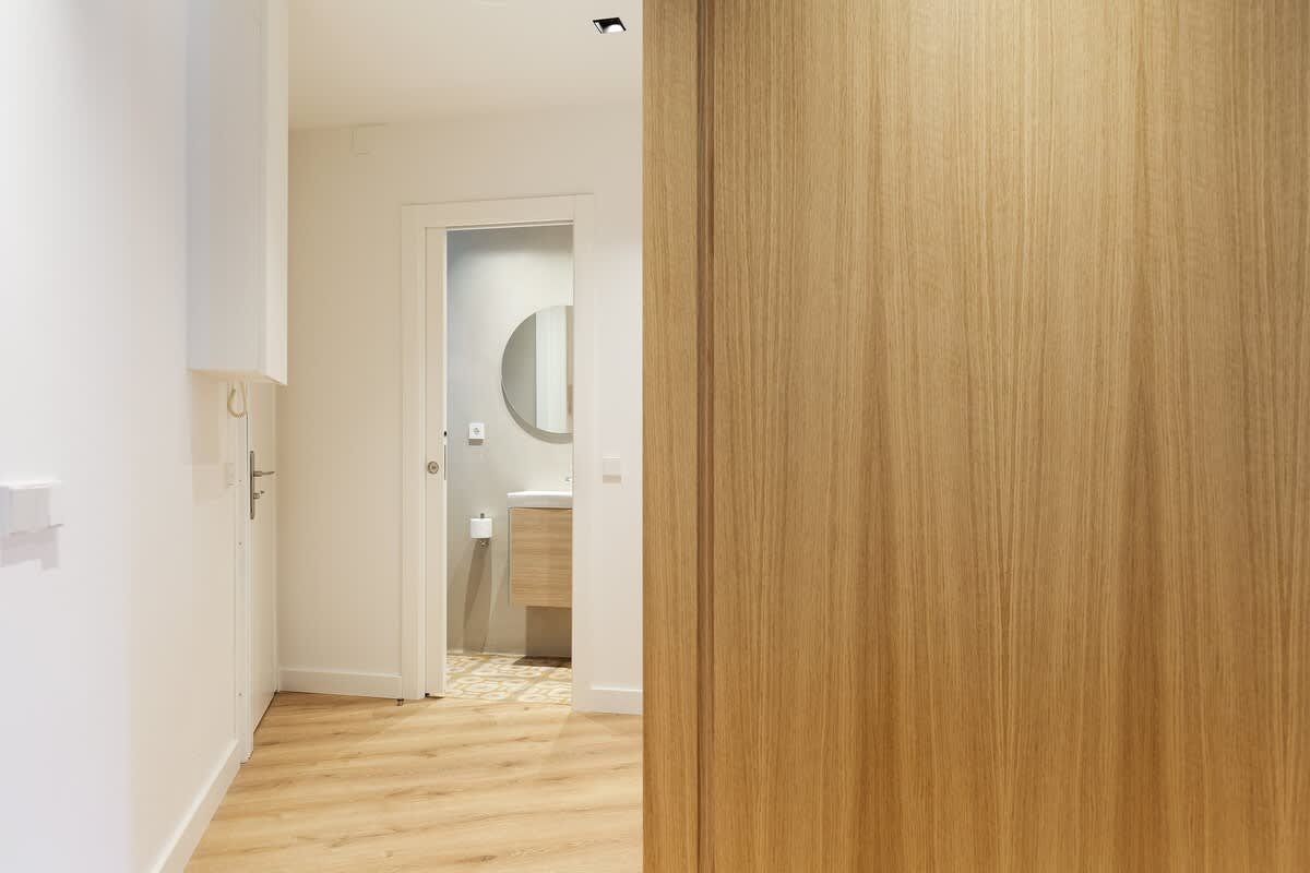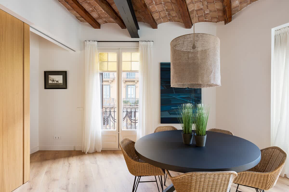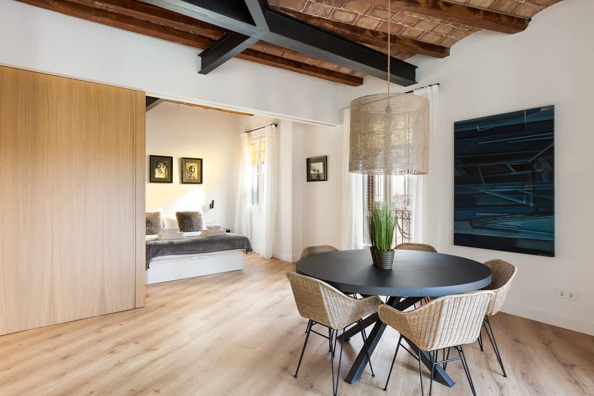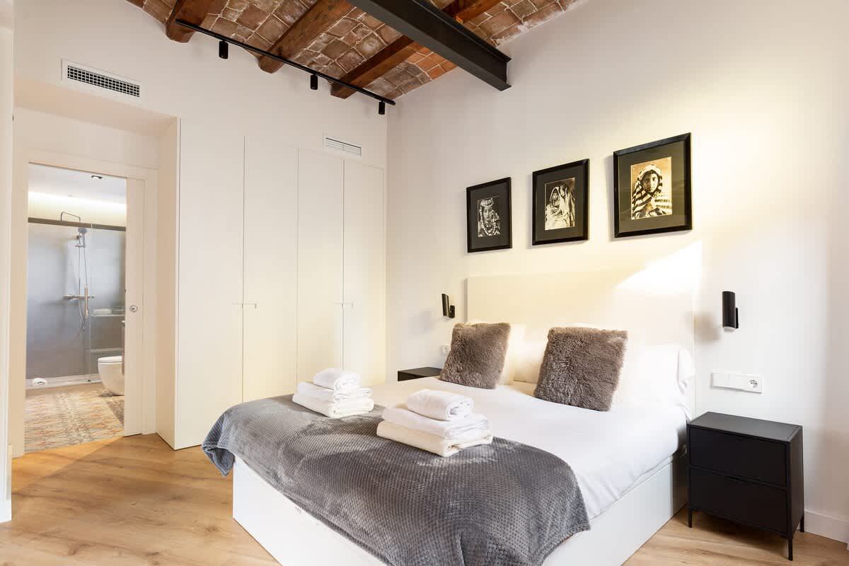 The living room’s main feature are the massive windows that let in plenty of natural light and give you views of the neighborhood below. A big TV and a big sofa in the corner also make this space a great place to relax after a day in Barcelona. There is also a big dining table on the other side of the living room. A modern touch, the big wooden sliding doors, separates or opens the space up for you to find the master bedroom with a double bed. The bigger bathroom is privately connected to this room. The ceilings are designed with exposed bricks, this is classic in Barcelona.