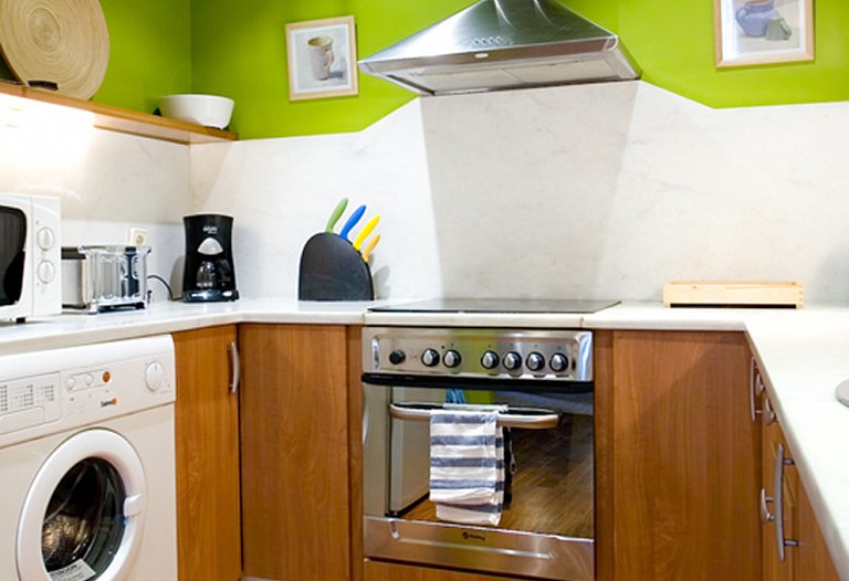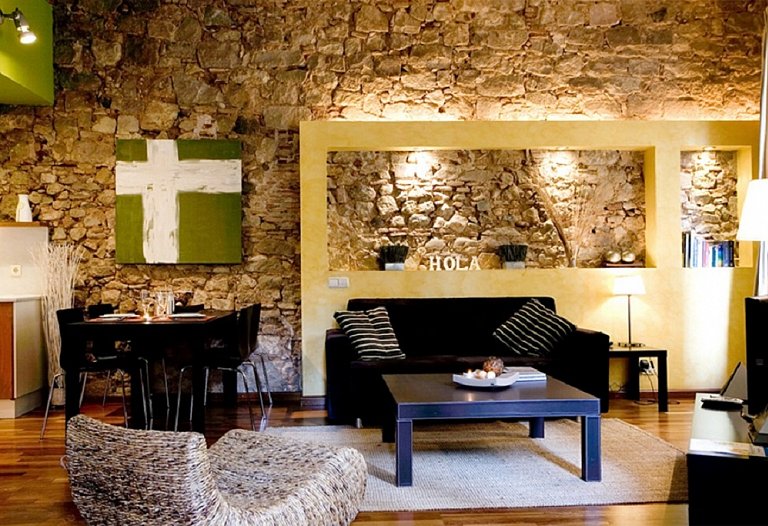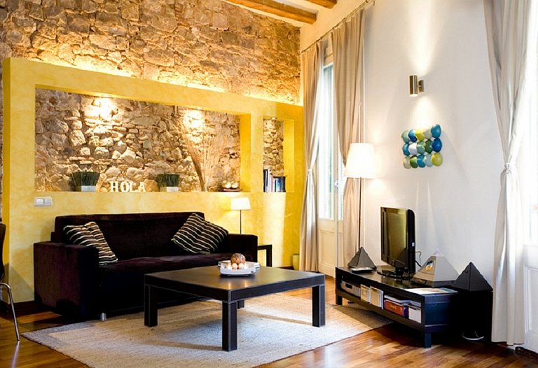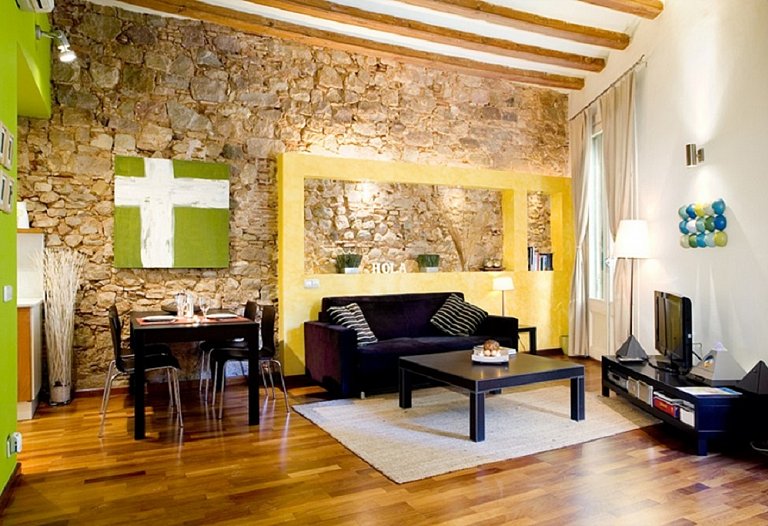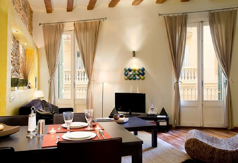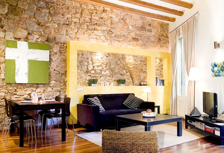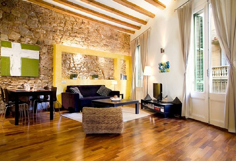 First floor, a luxury loft located in one of the noblest zone in the historic centre of Barcelona. Close to Paseo del Born in the middle ot the Gothic Quarter, just 50 m away from the Gothic Church of Sta. Maria del Mar, the Picasso Museum, the Cathedral and the port of Barcelona. Renovated building which conserves the historic fassade of the zone. 50 m2 area on the first floor with double balcony outside. It is a calm and luminous place. It´s a design apartment: restored wood-ceiling, original stone walls, parquet floor and design kitchen full equipped. A very large apartment distributed in entrance hall, living-room with a double sofa-bed, fully equipped kitchen, double room with too beds and complete equipped bathroom. Bed linen and towels. A perfect place to stay one person, a couple or four people.