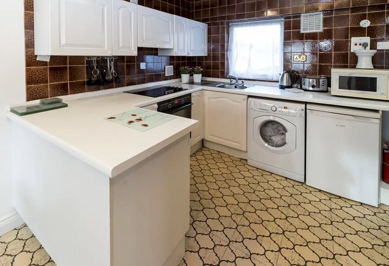 Well equipped kitchen with washer, dishwasher, fridge, cooker and microwave.